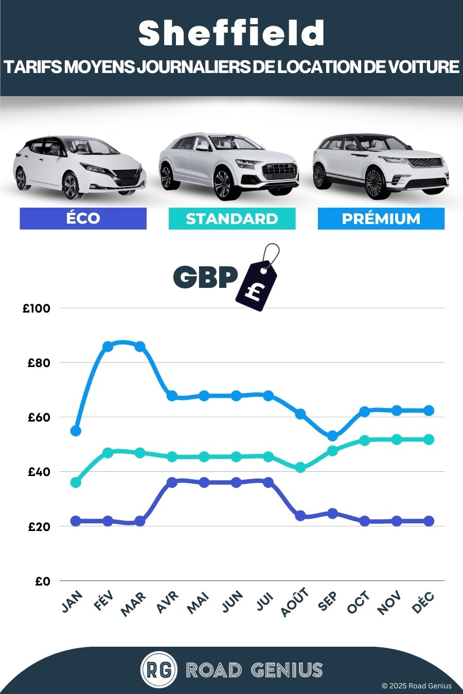 Comparez les lieux de prise en charge : les prix en centre-ville de Sheffield sont souvent plus bas qu'à l'aéroport de Manchester en raison des taxes d'aéroport. Vérifiez les deux options pour voir laquelle est la plus avantageuse pour vos dates.