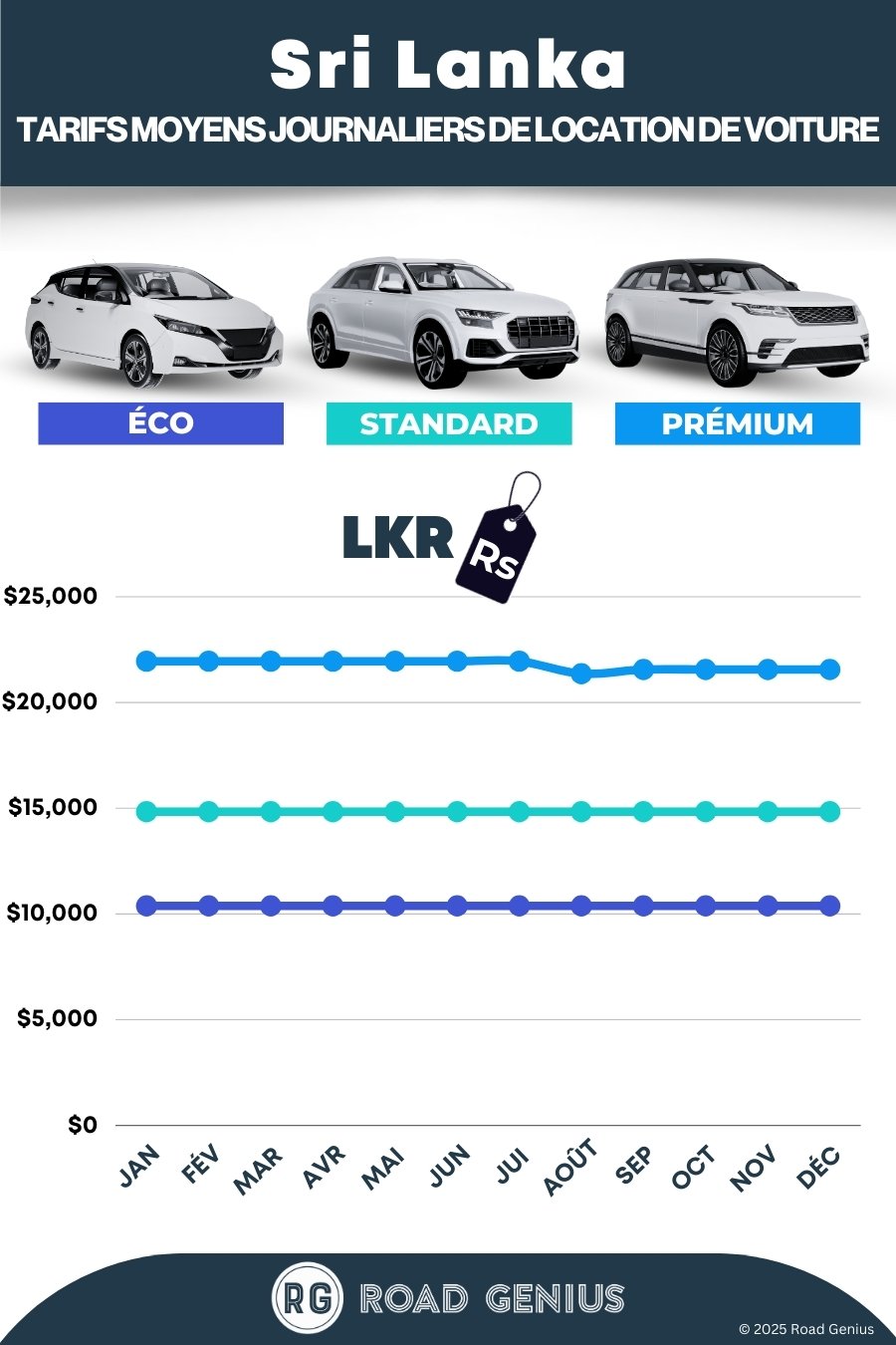 En moyenne, la location de voiture au Sri Lanka coûte environ 15 663 LKR par jour, les offres les moins chères étant disponibles dès 10 383 LKR par jour.