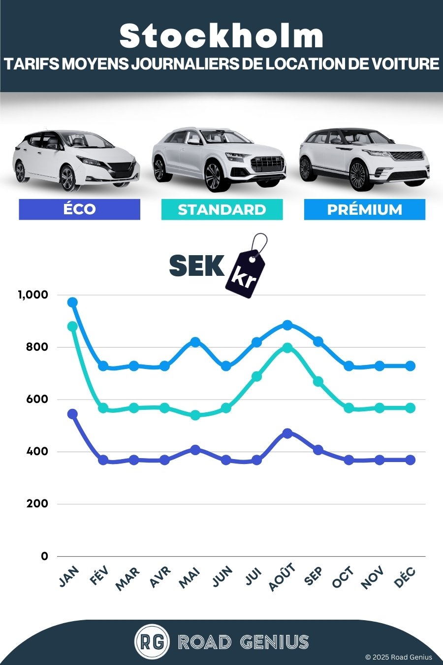 En moyenne, la location de voiture à Stockholm coûte environ 604 kr par jour, les offres les moins chères étant disponibles dès 369 kr par jour.