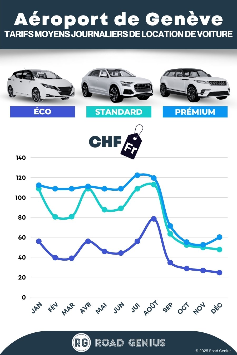 En moyenne, la location de voiture à l’aéroport de Genève coûte environ 74 CHF par jour, les offres les moins chères étant disponibles dès 25 CHF par jour.