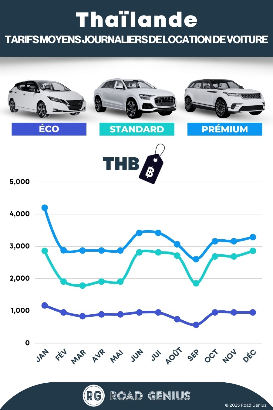 En moyenne, la location de voiture en Thaïlande coûte environ 2 150 THB par jour, les offres les moins chères étant disponibles dès 566 THB par jour.