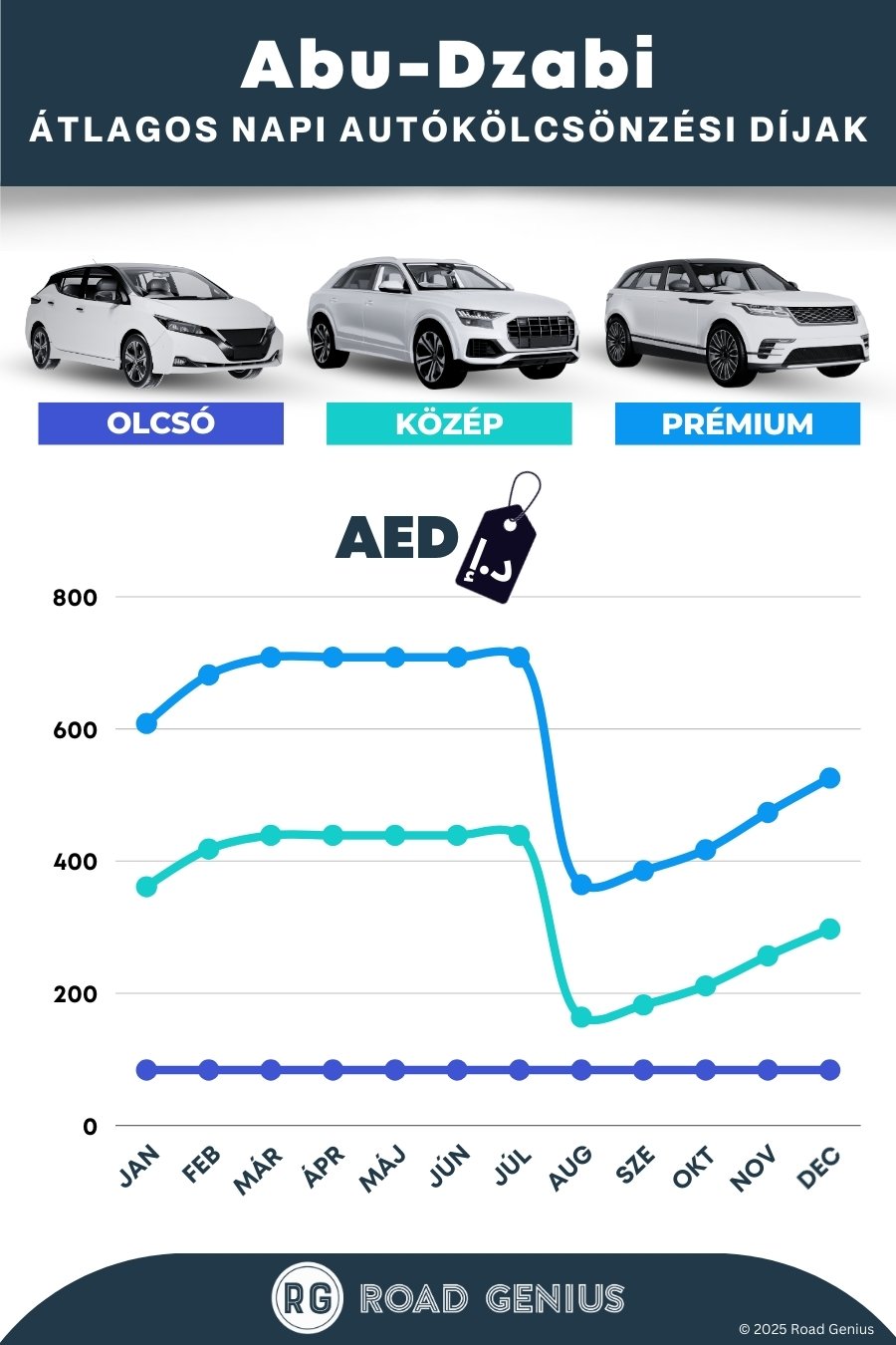 Átlagosan az autóbérlés Abu Dhabi-ban körülbelül 362 AED naponta kerül, a legolcsóbb bérleti díjak pedig 39 AED-től indulnak naponta.