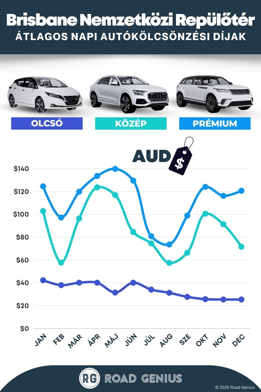 Átlagosan az autóbérlés a Brisbane-i repülőtéren (BNE) naponta körülbelül 103 AUD-ba kerül, a legolcsóbb bérlések pedig már 25 AUD-tól elérhetők naponta.
