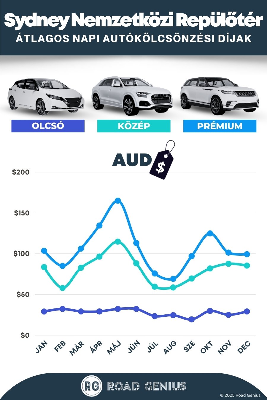 Átlagosan a Sydney-i repülőtéren (SYD) az autóbérlés naponta körülbelül 93 AUD-ba kerül, a legolcsóbb bérlések pedig napi 19 AUD-tól érhetők el.