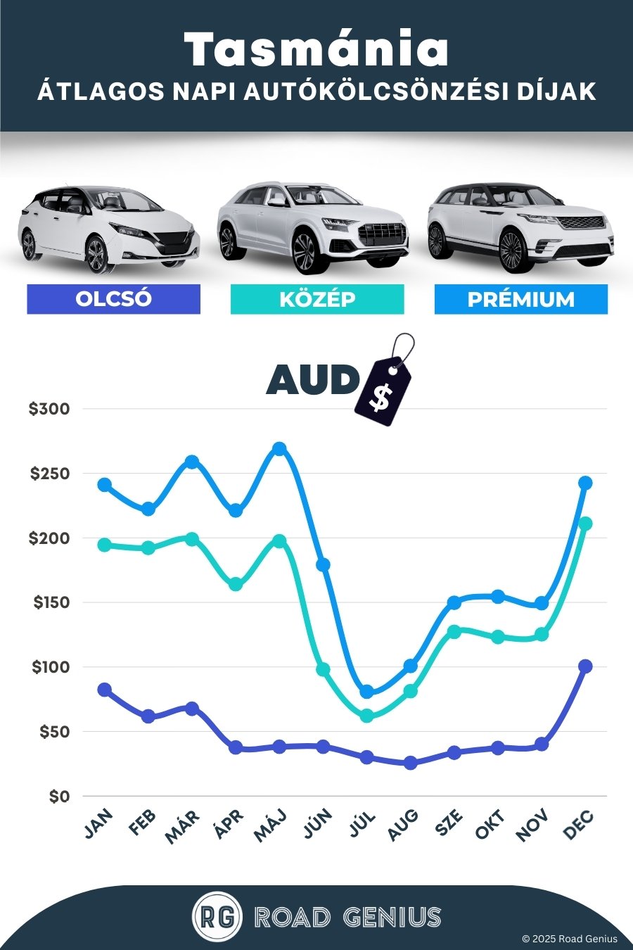 Átlagosan az autóbérlés Tasmania-ban körülbelül AUD $129 naponta kerül, a legolcsóbb bérleti díjak pedig AUD $26-tól indulnak naponta.