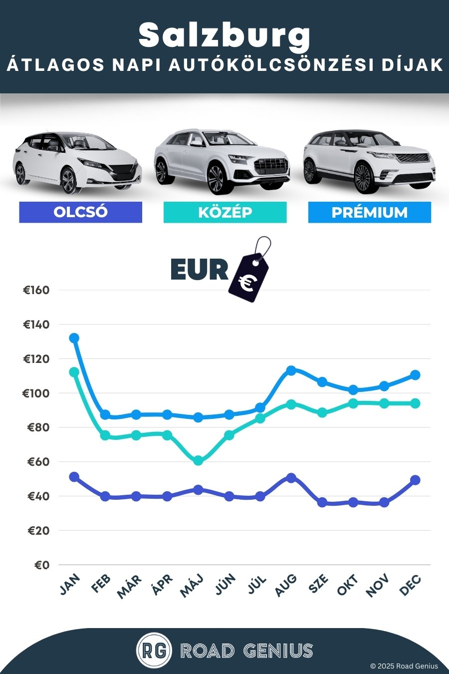 Átlagosan az autóbérlés Salzburgban körülbelül 76 € naponta kerül, a legolcsóbb bérleti díjak pedig 36 €-tól indulnak naponta.