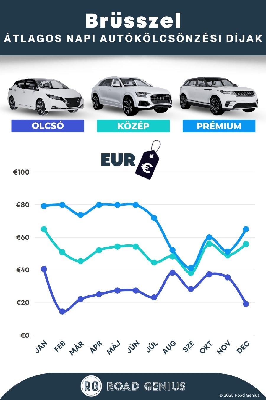 Átlagosan az autóbérlés Brüsszelben körülbelül 49 € naponta kerül, a legolcsóbb bérleti díjak pedig 14 €-tól indulnak naponta.