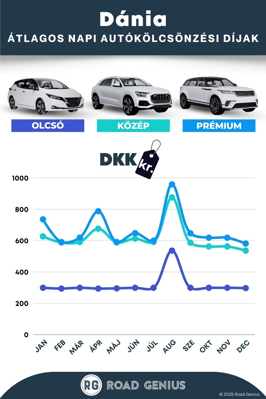 Átlagosan az autóbérlés Denmark-ban körülbelül 533 kr. naponta kerül, a legolcsóbb bérleti díjak pedig 294 kr.-tól indulnak naponta.