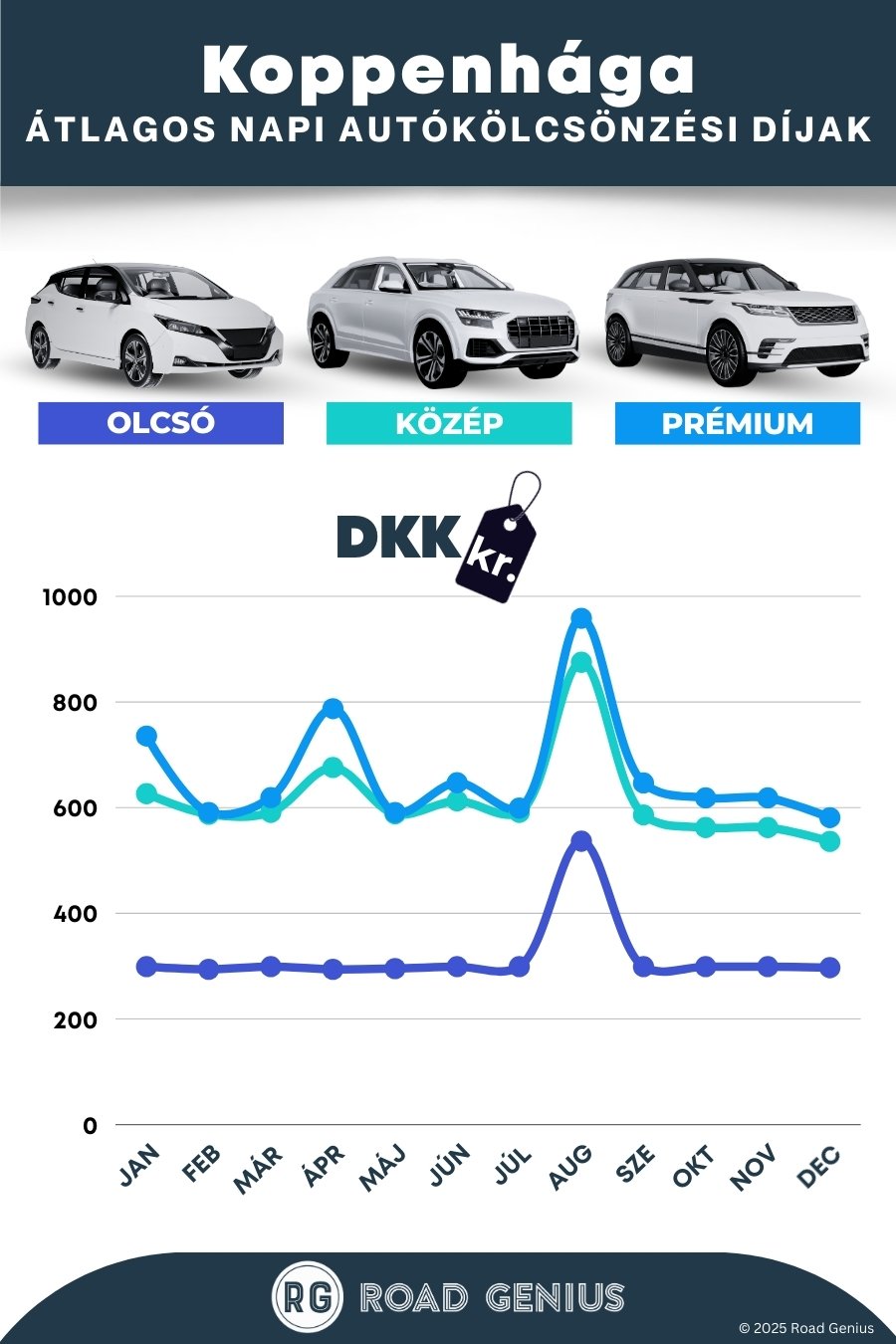 Átlagosan az autóbérlés Koppenhágában körülbelül 533 kr. naponta kerül, a legolcsóbb bérleti díjak pedig 294 kr.-tól indulnak naponta.