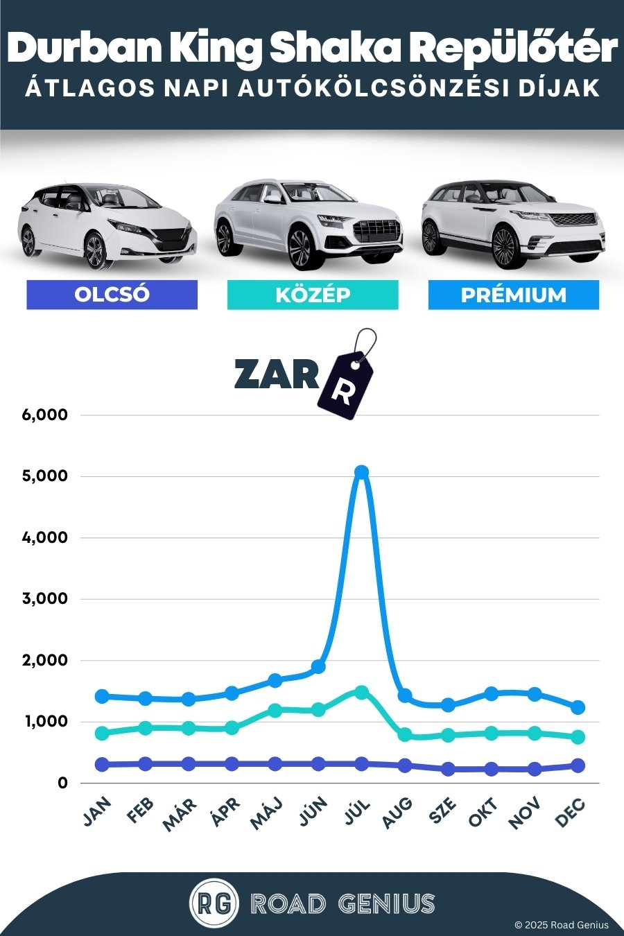 Átlagosan az autóbérlés Durban King Shaka Airport-on körülbelül ZAR 997 naponta kerül, a legolcsóbb bérleti díjak pedig ZAR 230-tól indulnak naponta.