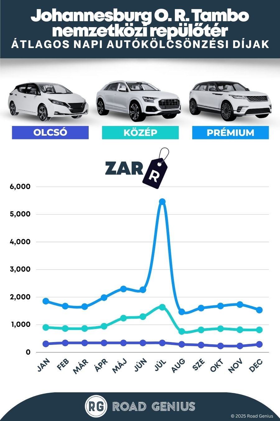 Átlagosan az autóbérlés Johannesburg O.R. Tambo Airport-on körülbelül ZAR 1,128 naponta kerül, a legolcsóbb bérleti díjak pedig ZAR 230-tól indulnak naponta.