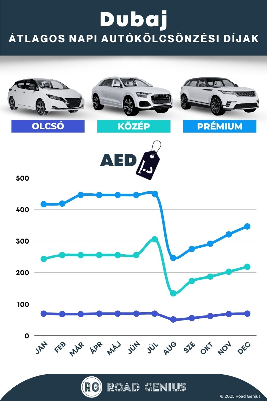 Átlagosan az autóbérlés Dubai-ban körülbelül 224 AED naponta kerül, a legolcsóbb bérleti díjak pedig 51 AED-től indulnak naponta.