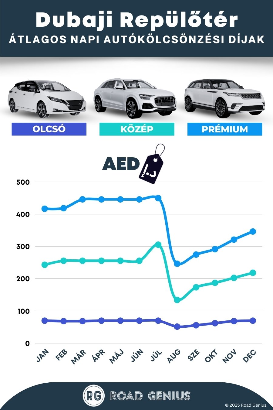 Átlagosan az autóbérlés Dubai Airport-on körülbelül 224 AED naponta kerül, a legolcsóbb bérleti díjak pedig 51 AED-től indulnak naponta.