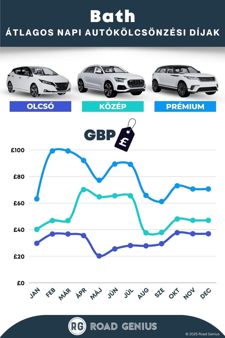 Átlagosan az autóbérlés Bath-ban körülbelül 54 € naponta kerül, a legolcsóbb bérleti díjak pedig 20 €-tól indulnak naponta.