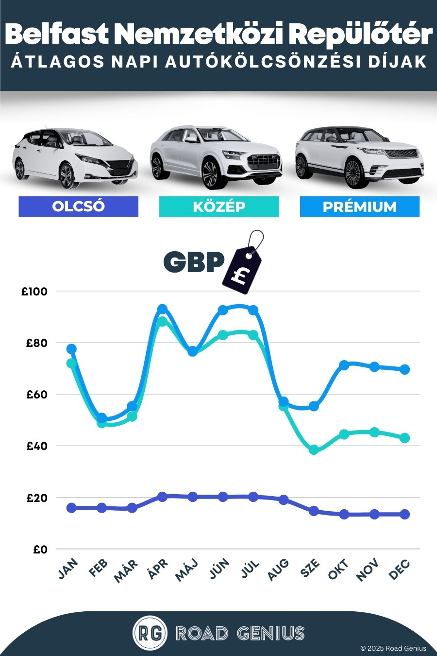 Átlagosan az autóbérlés Belfast International Airport-on körülbelül 50 € naponta kerül, a legolcsóbb bérleti díjak pedig 13 €-tól indulnak naponta.