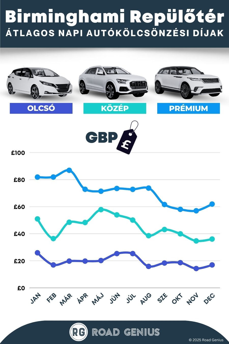 Átlagosan az autóbérlés Birmingham Airport-on körülbelül 45 € naponta kerül, a legolcsóbb bérleti díjak pedig 14 €-tól indulnak naponta.