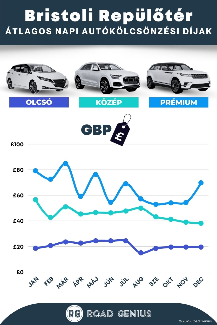 Átlagosan az autóbérlés Bristol Airport-on körülbelül 44 € naponta kerül, a legolcsóbb bérleti díjak pedig 15 €-től indulnak naponta.