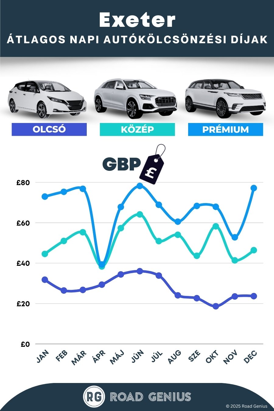 Átlagosan az autóbérlés Exeter-ben körülbelül 48 € naponta kerül, a legolcsóbb bérleti díjak pedig 19 €-től indulnak naponta.