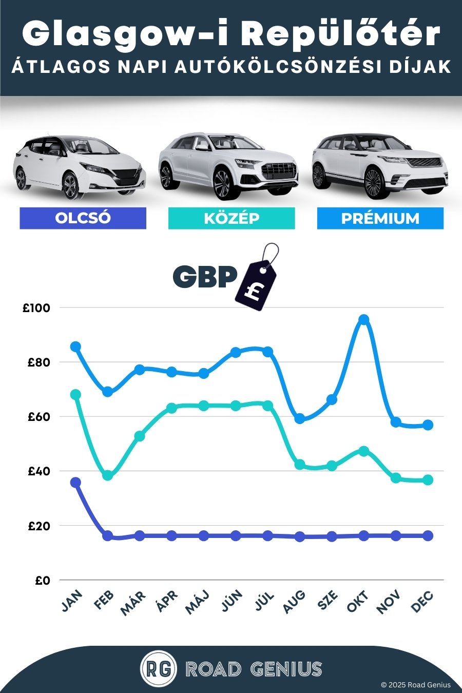 Átlagosan az autóbérlés Glasgow Airport-on körülbelül 48 € naponta kerül, a legolcsóbb bérleti díjak pedig 16 €-tól indulnak naponta.