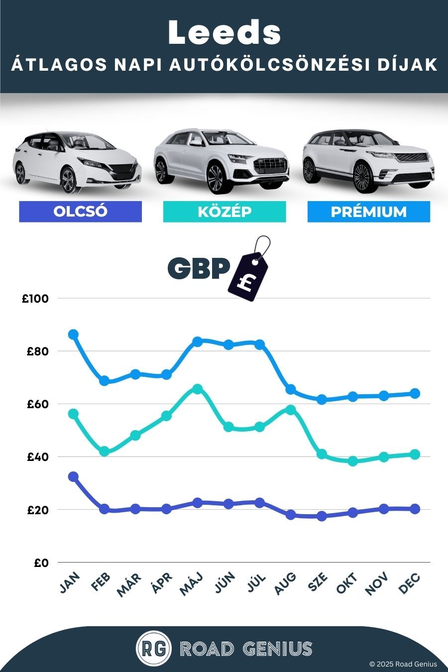 Átlagosan az autóbérlés Leeds-ben körülbelül 47 € naponta kerül, a legolcsóbb bérleti díjak pedig 17 €-tól indulnak naponta.