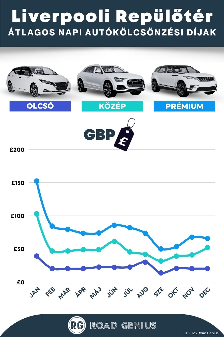 Átlagosan az autóbérlés Liverpool Airport-on körülbelül 51 € naponta kerül, a legolcsóbb bérleti díjak pedig 14 €-tól indulnak naponta.