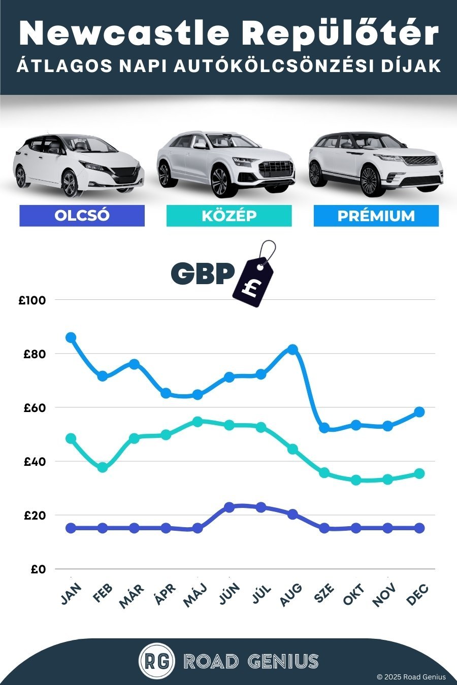 Átlagosan az autóbérlés Newcastle Airport-on körülbelül 55 € naponta kerül, a legolcsóbb bérleti díjak pedig 12 €-tól indulnak naponta.