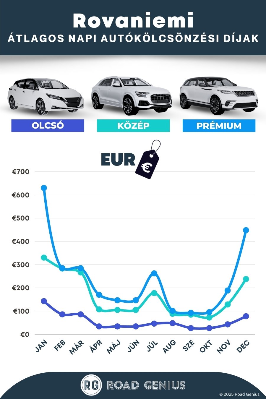 Átlagosan az autóbérlés Rovaniemiben körülbelül 153 € naponta kerül, a legolcsóbb bérleti díjak pedig 27 €-tól indulnak naponta.