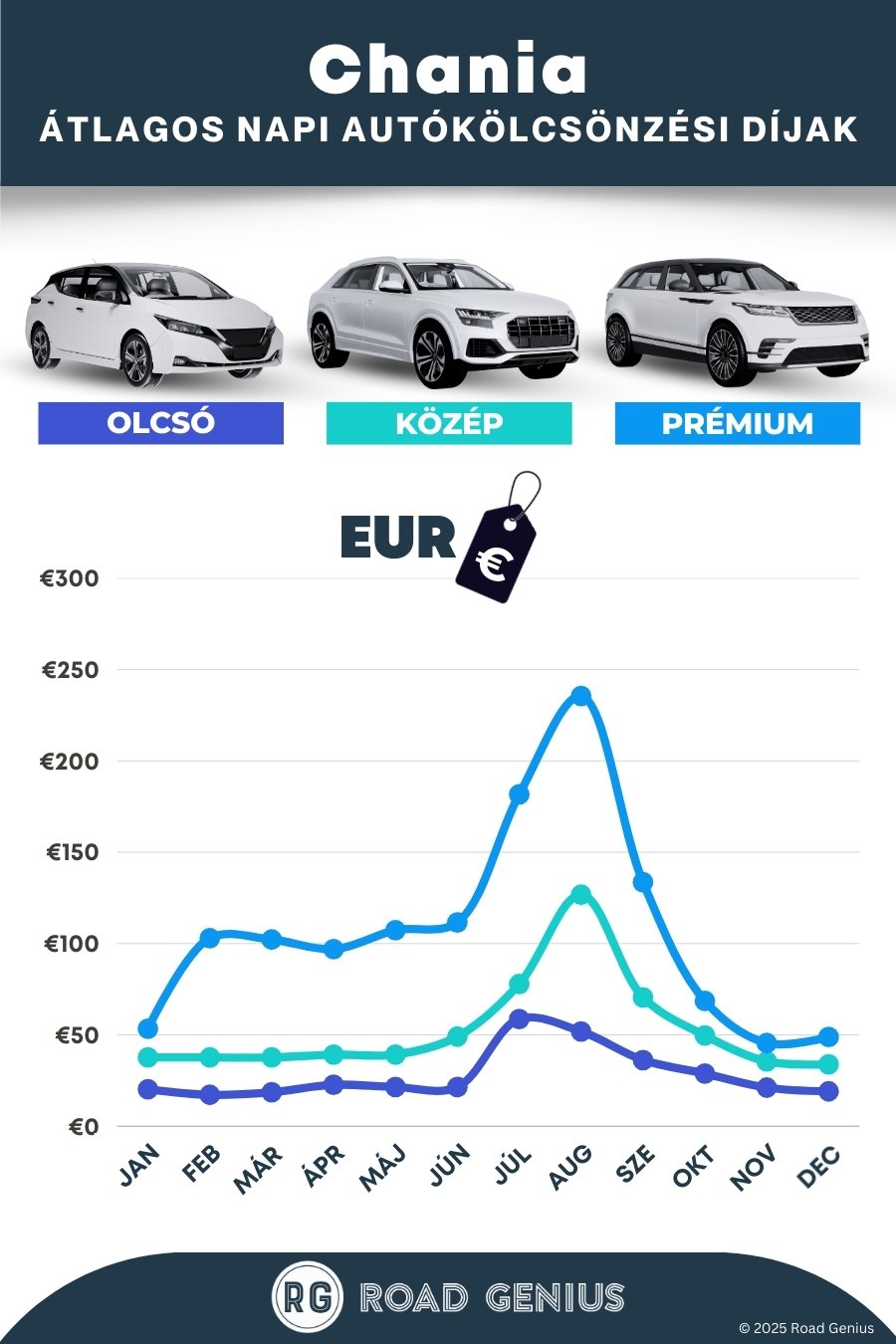 Átlagosan az autóbérlés Chaniában körülbelül 63 € naponta kerül, a legolcsóbb bérleti díjak pedig 17 €-tól indulnak naponta.