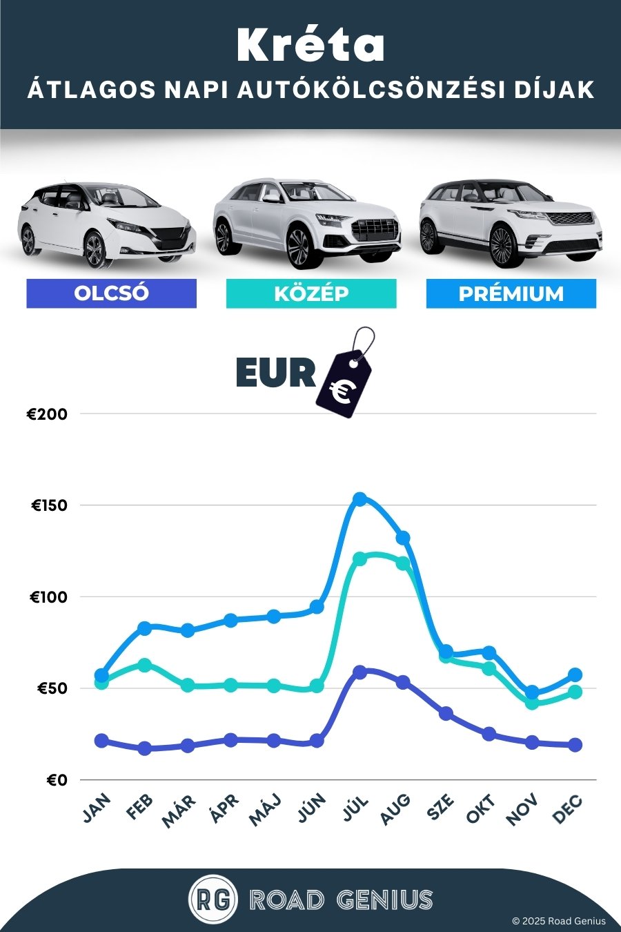Átlagosan az autóbérlés Crete-ben körülbelül 59 € naponta kerül, a legolcsóbb bérleti díjak pedig 17 €-tól indulnak naponta.