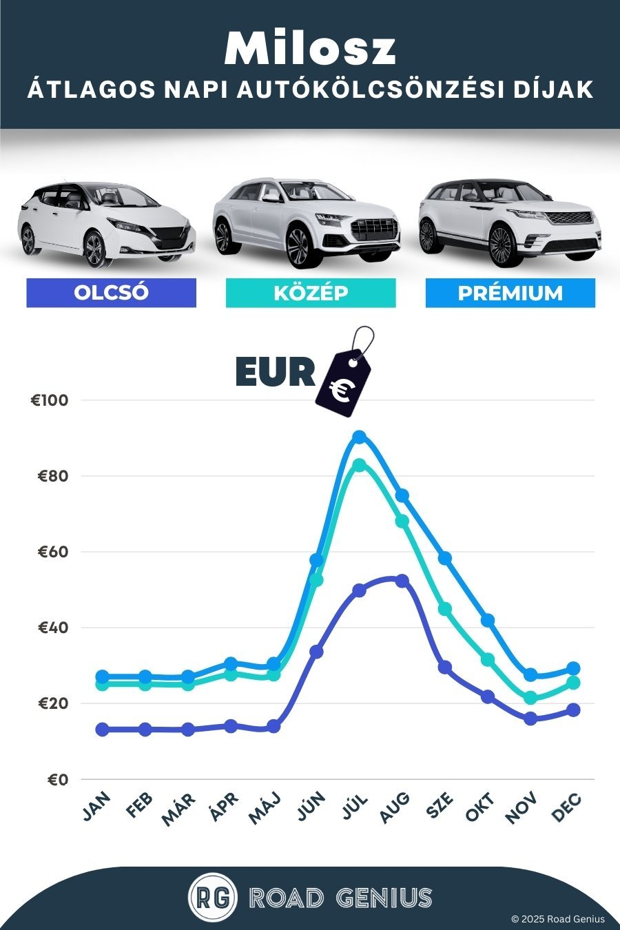 Átlagosan az autóbérlés Milóson körülbelül 35 € naponta kerül, a legolcsóbb bérleti díjak pedig 13 €-tól indulnak naponta.