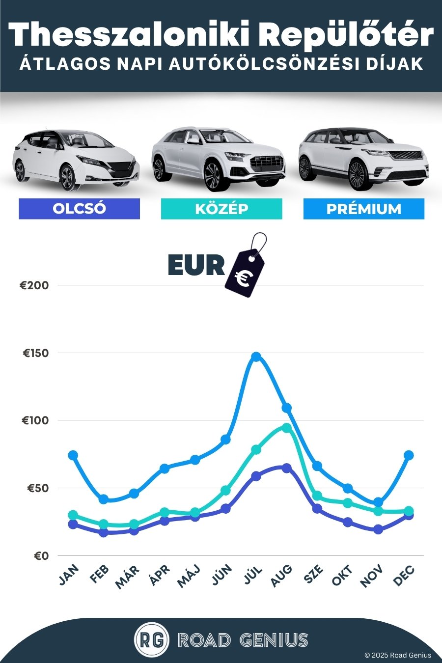 Átlagosan az autóbérlés Thessaloniki Airport-on körülbelül 49 € naponta kerül, a legolcsóbb bérleti díjak pedig 17 €-tól indulnak naponta.