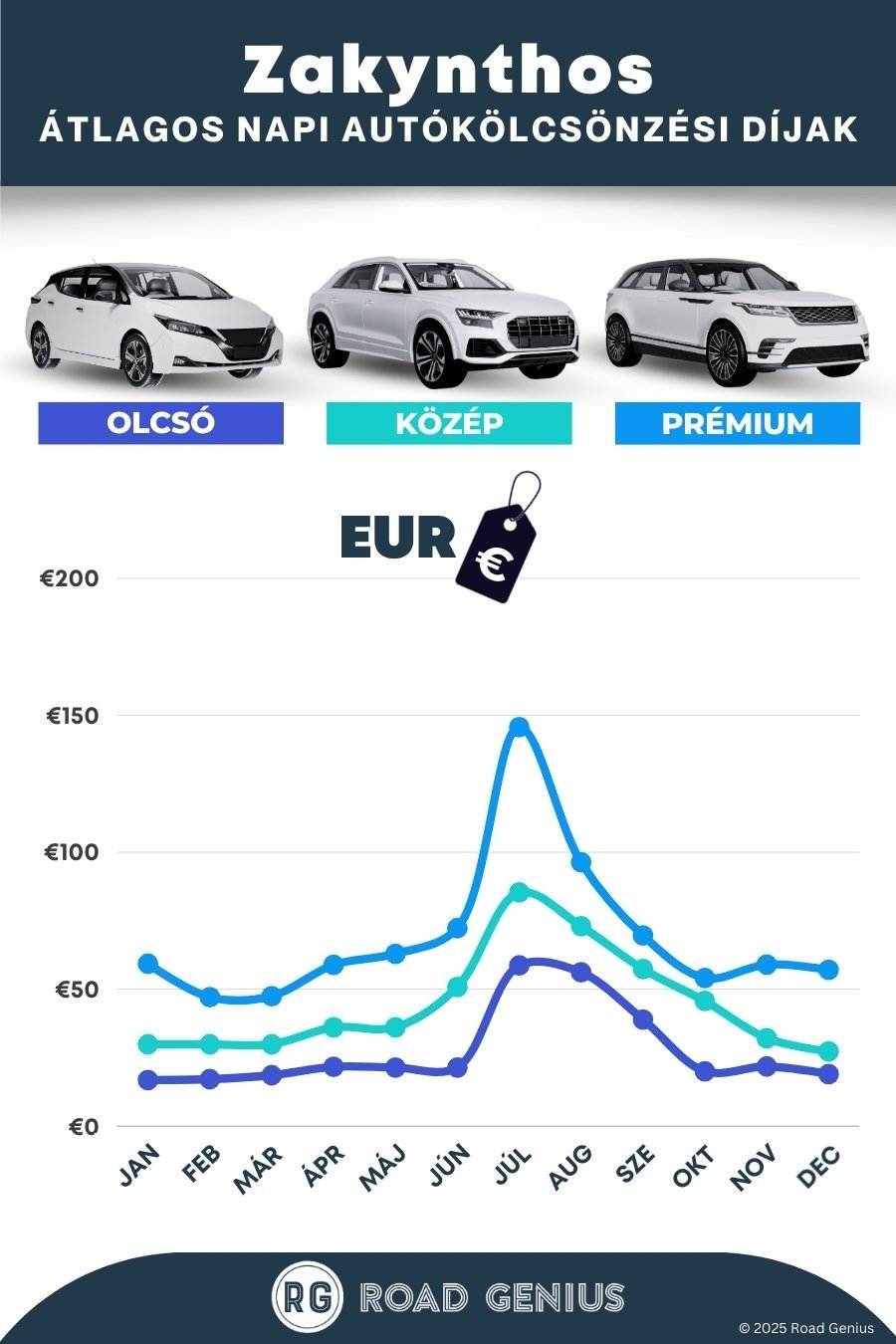 Átlagosan az autóbérlés Zakynthoszon körülbelül 47 € naponta kerül, a legolcsóbb bérleti díjak pedig 17 €-tól indulnak naponta.