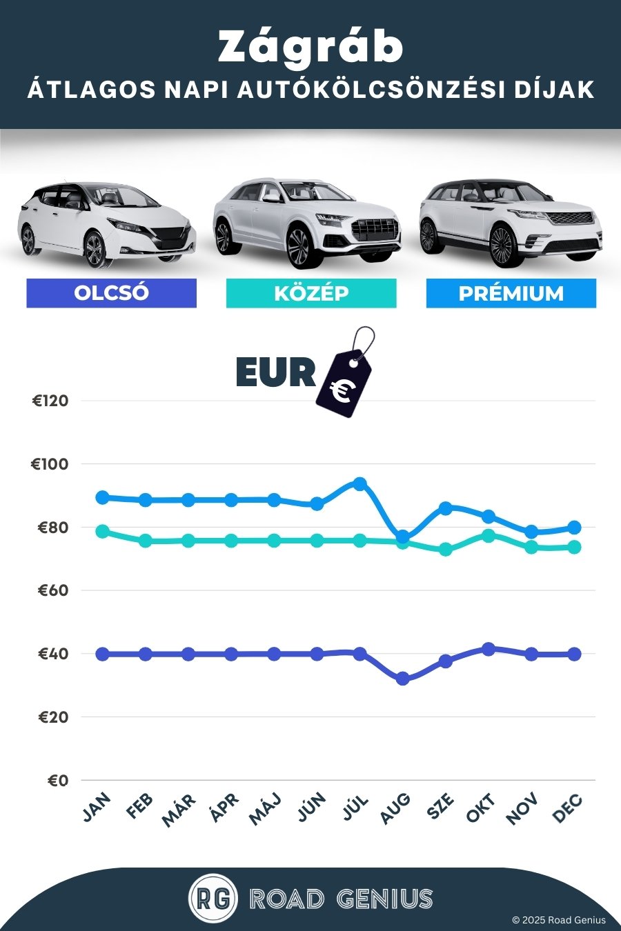Átlagosan az autóbérlés Zágrábban körülbelül 67 € naponta kerül, a legolcsóbb bérleti díjak pedig 32 €-tól indulnak naponta.