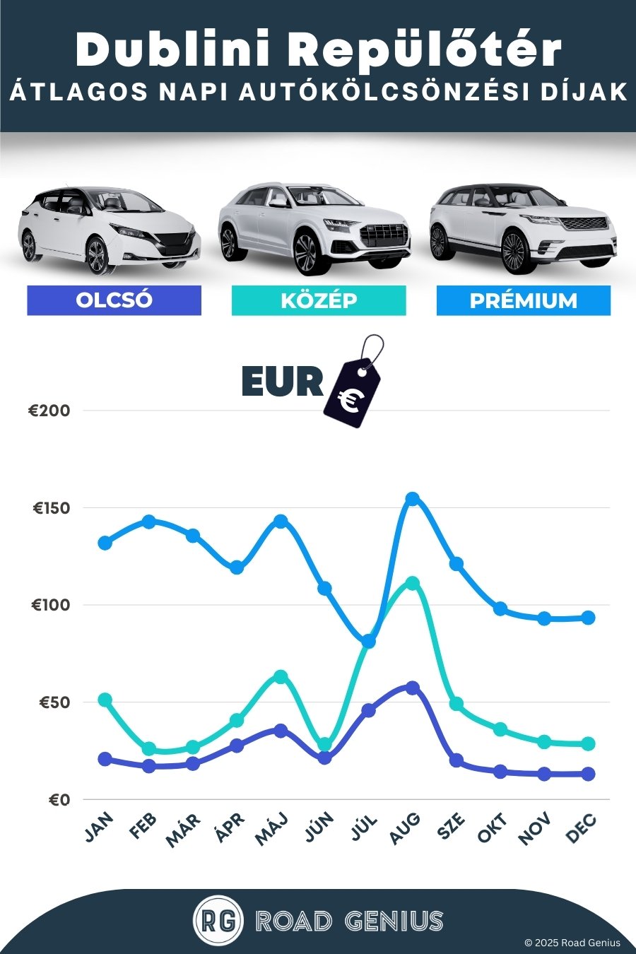 Átlagosan az autóbérlés Dublin Airport-on körülbelül 64 € naponta kerül, a legolcsóbb bérleti díjak pedig 13 €-tól indulnak naponta.