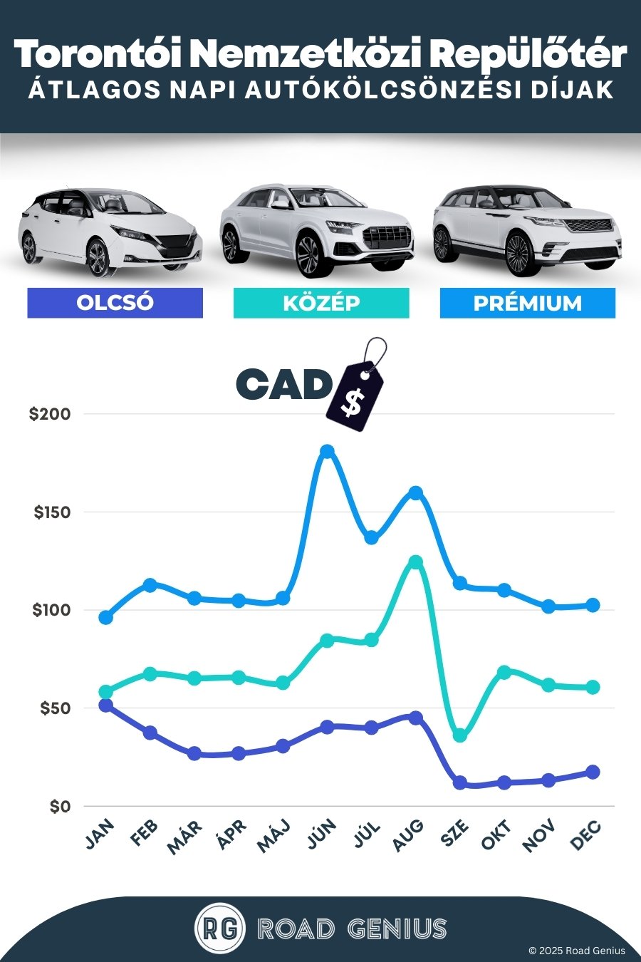 Átlagosan az autóbérlés Toronto International Airport-on körülbelül 73 CAD naponta kerül, a legolcsóbb bérleti díjak pedig 12 CAD-tól indulnak naponta.
