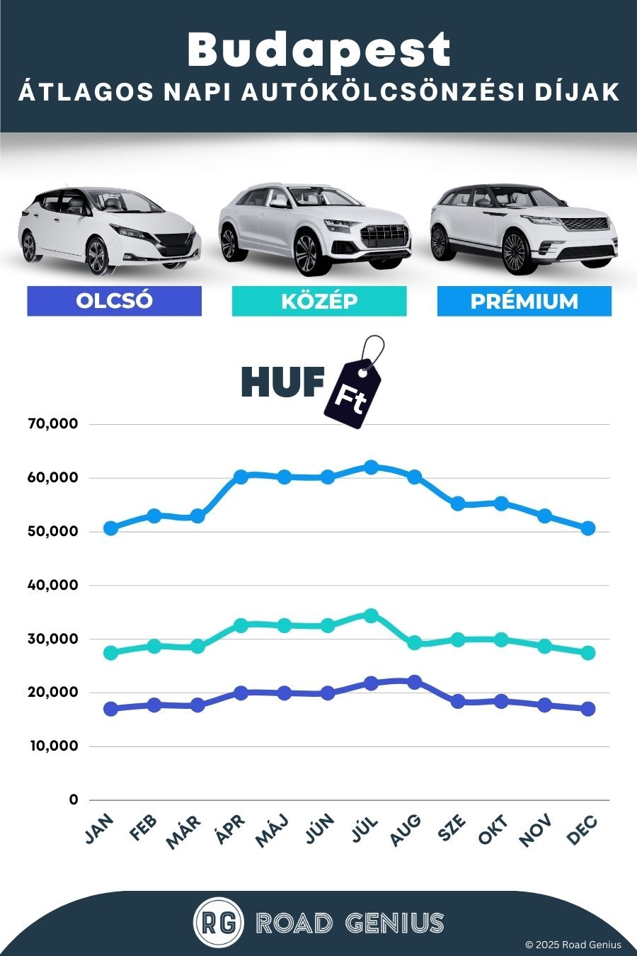 Átlagosan az autóbérlés Budapesten körülbelül 35 103 HUF naponta kerül, a legolcsóbb bérleti díjak pedig 17 023 HUF-tól indulnak naponta.