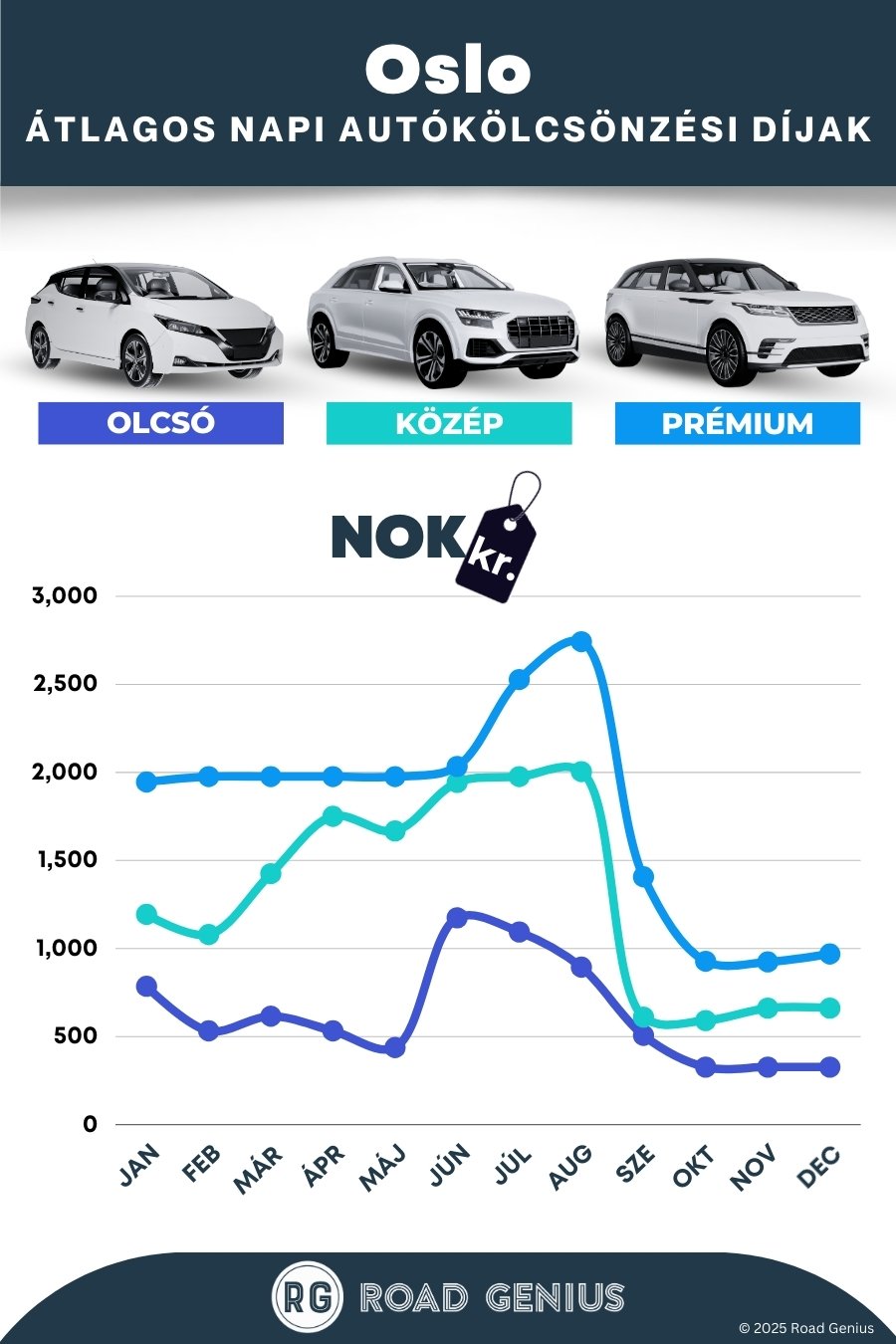 Átlagosan az autóbérlés Oslo-ban körülbelül 1,236 kr naponta kerül, a legolcsóbb bérleti díjak pedig 327 kr-tól indulnak naponta.