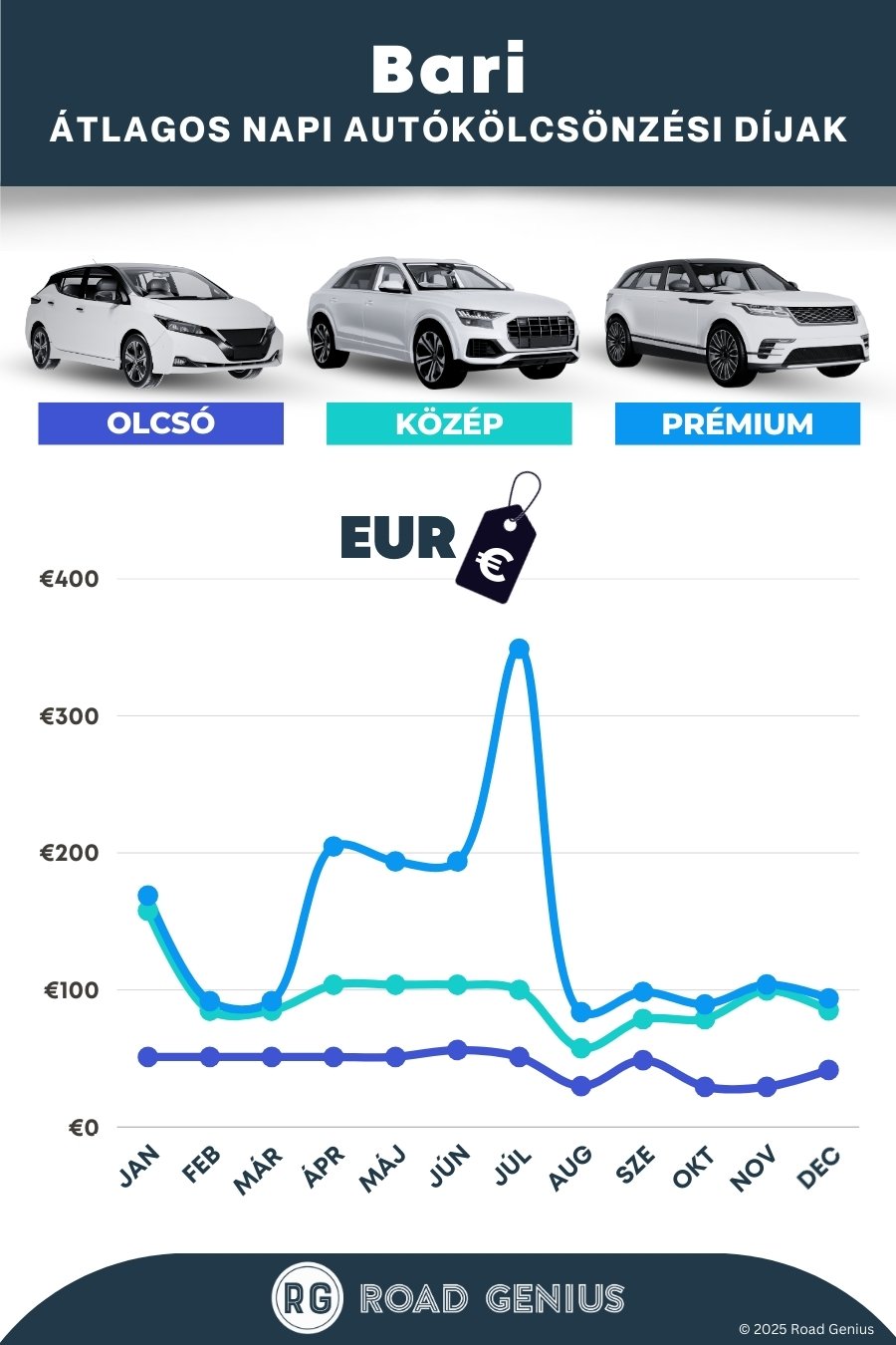 Átlagosan az autóbérlés Bariban körülbelül 96 € naponta kerül, a legolcsóbb bérleti díjak pedig 29 €-tól indulnak naponta.