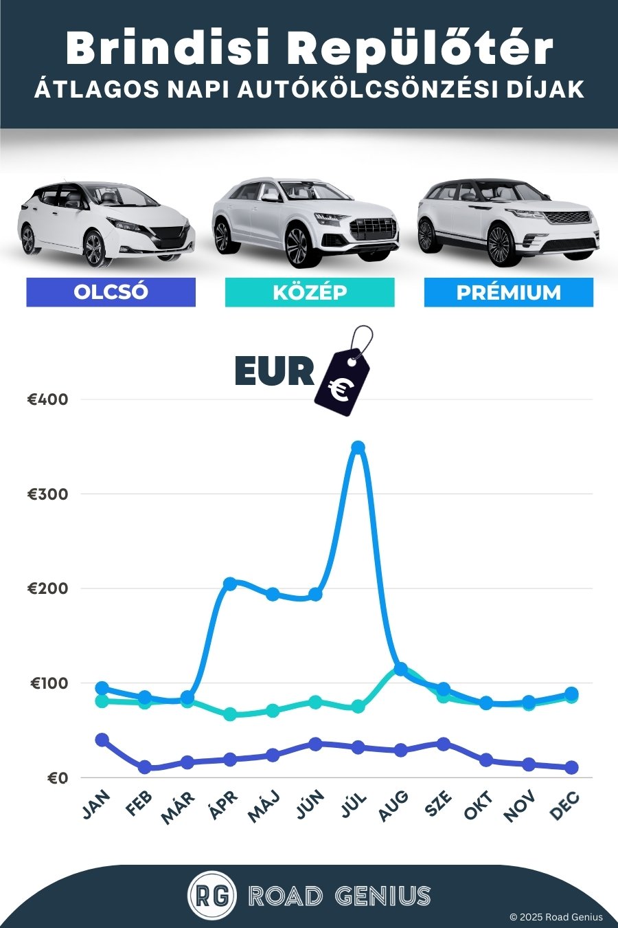 Átlagosan az autóbérlés Brindisi Airport-on körülbelül 81 € naponta kerül, a legolcsóbb bérleti díjak pedig 11 €-tól indulnak naponta.