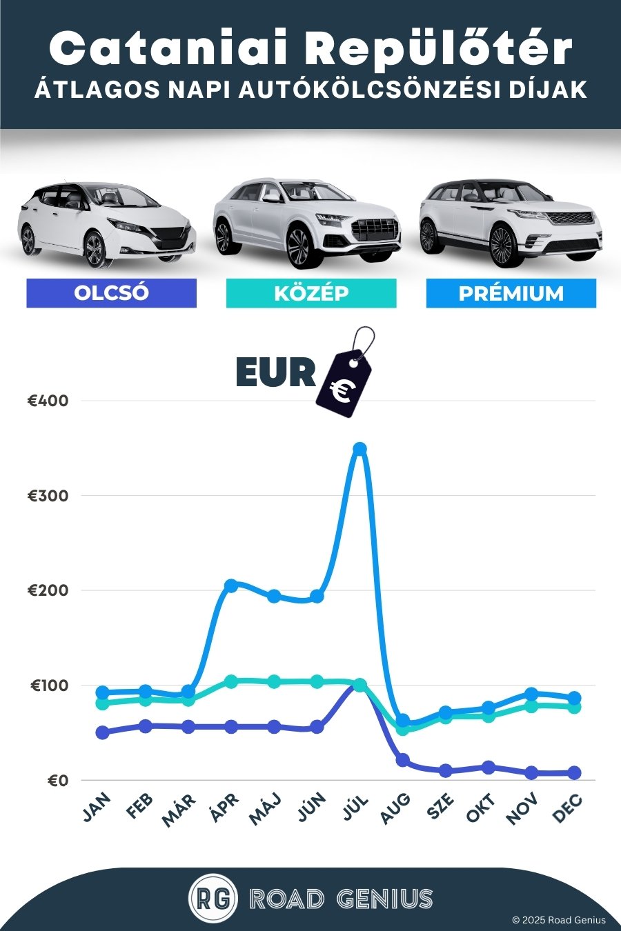 Átlagosan az autóbérlés Catania Airport-on körülbelül 86 € naponta kerül, a legolcsóbb bérleti díjak pedig 8 €-tól indulnak naponta.