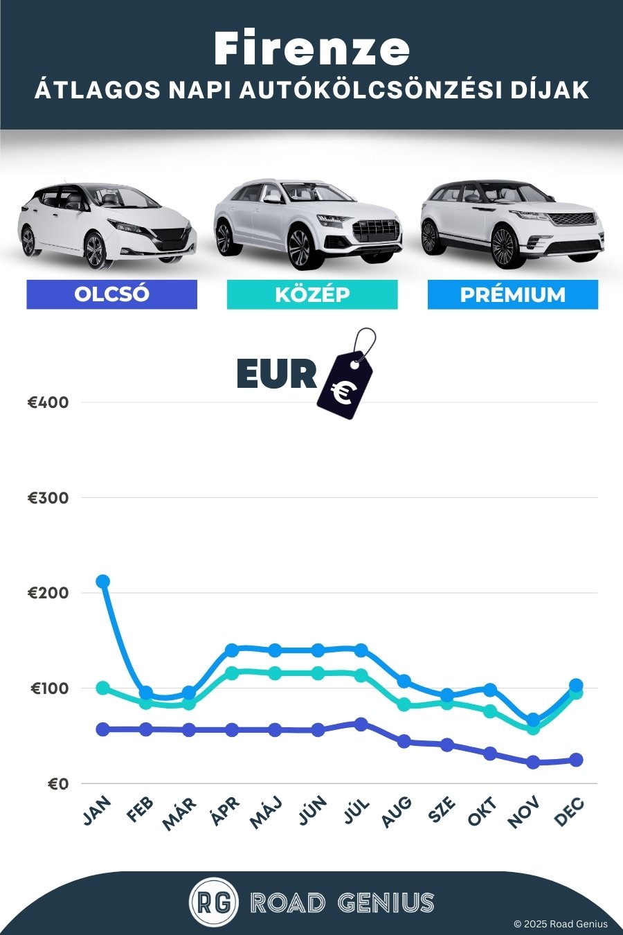 Átlagosan az autóbérlés Firenzében körülbelül 87 € naponta kerül, a legolcsóbb bérleti díjak pedig 22 €-tól indulnak naponta.
