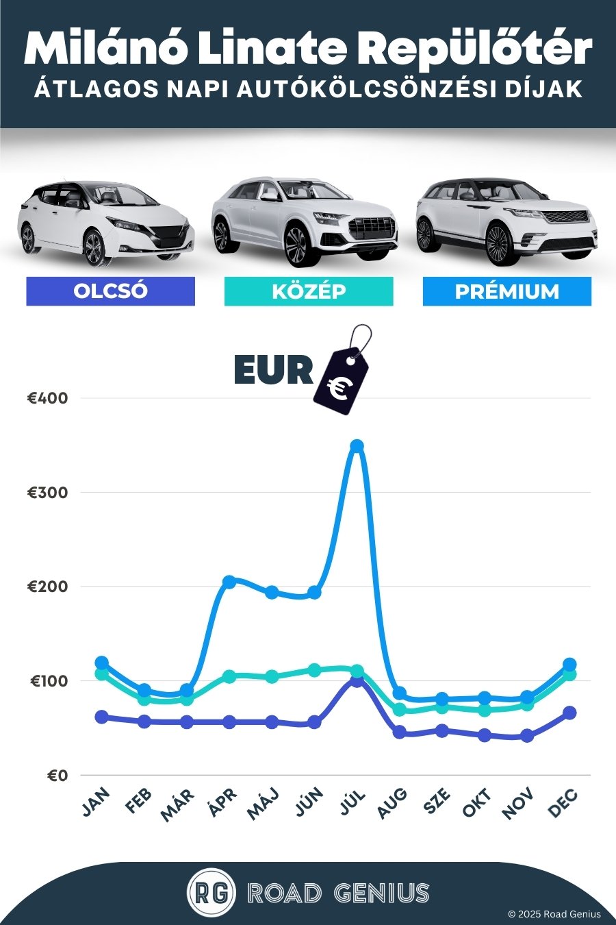 Átlagosan az autóbérlés Milan Linate Airport-on körülbelül 96 € naponta kerül, a legolcsóbb bérleti díjak pedig 42 €-tól indulnak naponta.