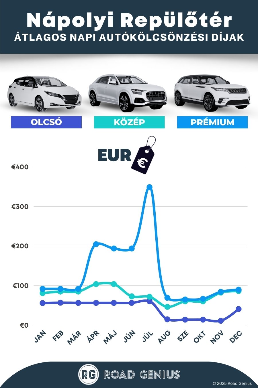 Átlagosan az autóbérlés Naples Airport-on körülbelül 84 € naponta kerül, a legolcsóbb bérleti díjak pedig 11 €-tól indulnak naponta.