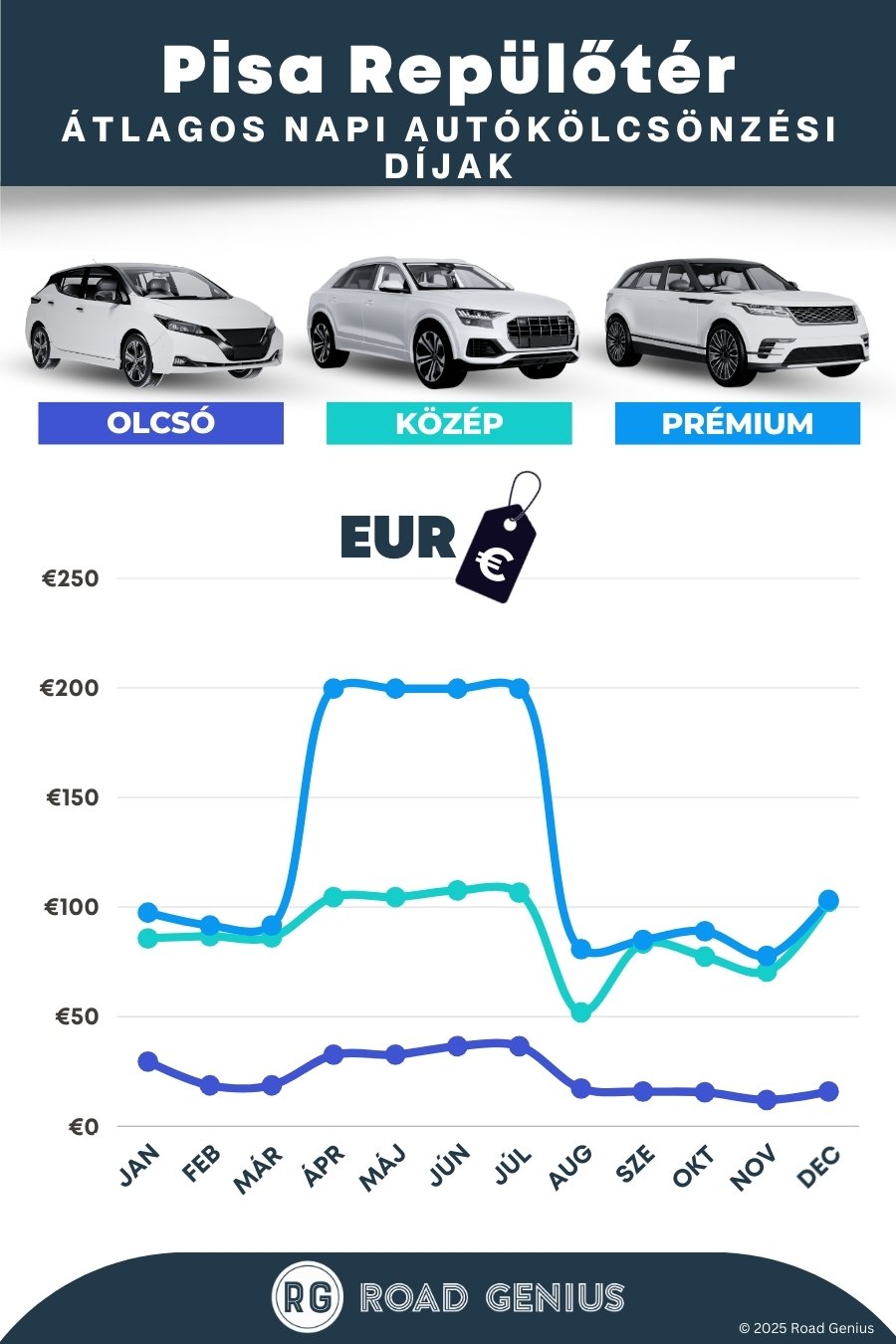 Átlagosan az autóbérlés Pisa Airport-on körülbelül 80 € naponta kerül, a legolcsóbb bérleti díjak pedig 12 €-tól indulnak naponta.
