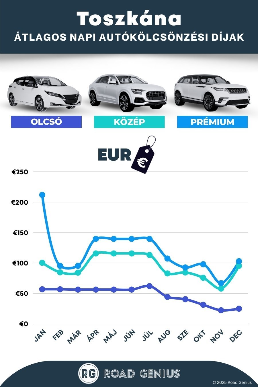 Átlagosan az autóbérlés Tuscany-ban körülbelül 87 € naponta kerül, a legolcsóbb bérleti díjak pedig 22 €-tól indulnak naponta.