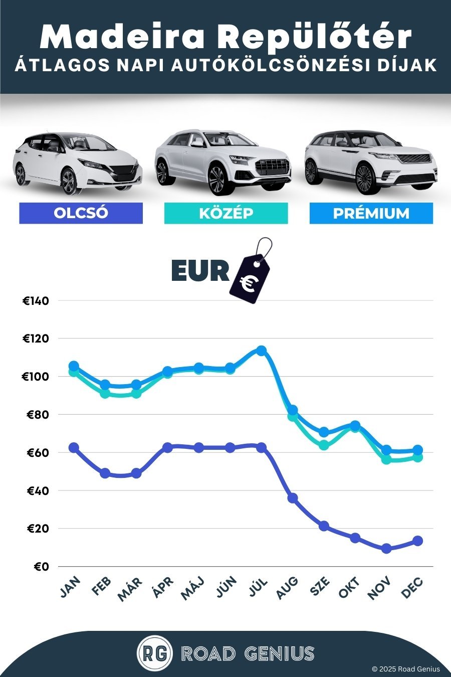 Átlagosan az autóbérlés Madeira Airport-on körülbelül 73 € naponta kerül, a legolcsóbb bérleti díjak pedig 9 €-tól indulnak naponta.
