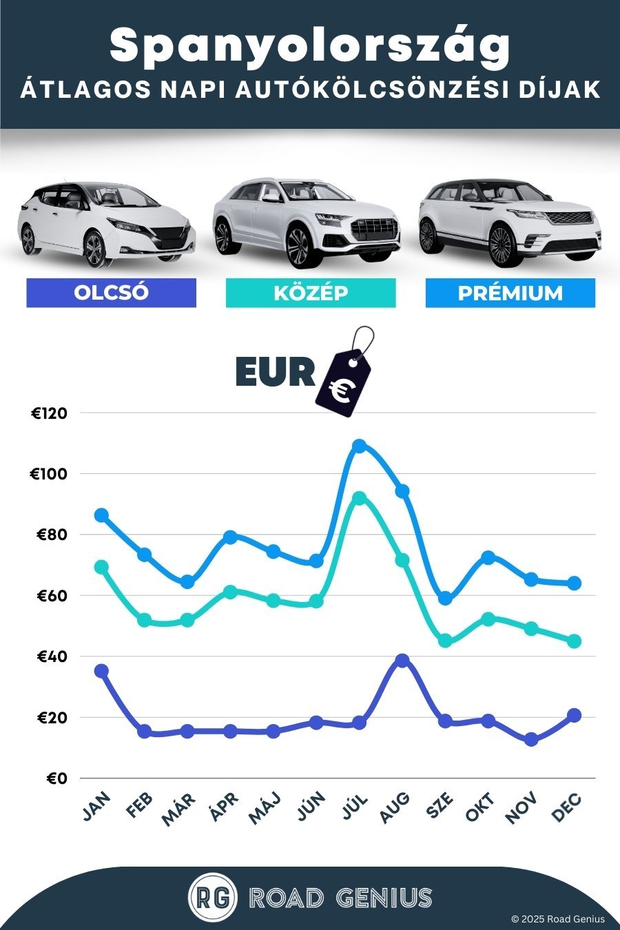Átlagosan az autóbérlés Spain-ben körülbelül 52 € naponta kerül, a legolcsóbb bérleti díjak pedig 13 €-tól indulnak naponta.