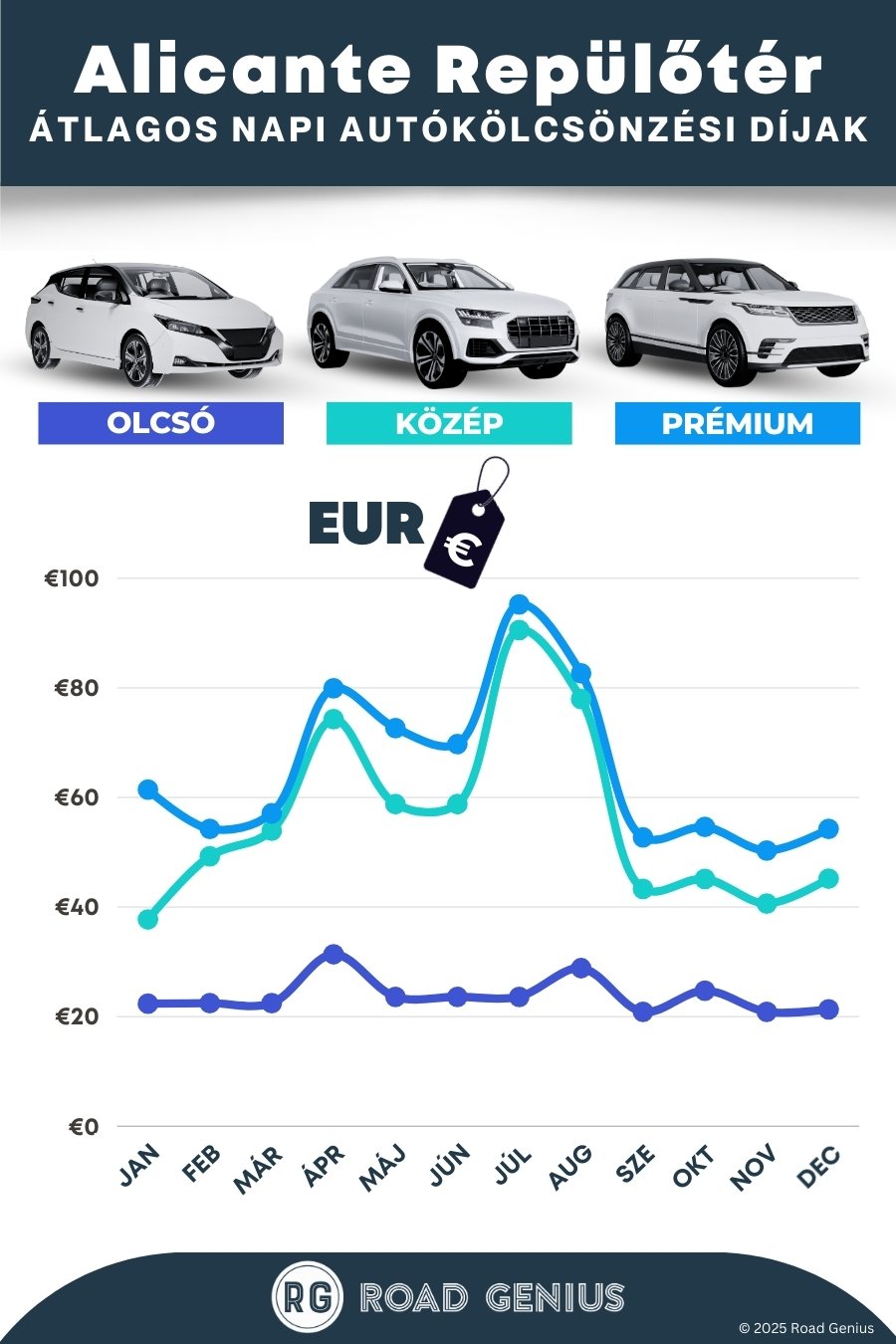 Átlagosan az autóbérlés Alicante Airport-on körülbelül 49 € naponta kerül, a legolcsóbb bérleti díjak pedig 21 €-tól indulnak naponta.