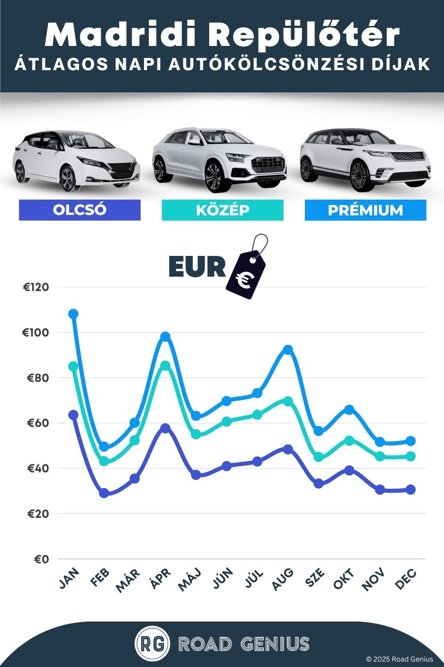 Átlagosan az autóbérlés Madrid Airport-on körülbelül 56 € naponta kerül, a legolcsóbb bérleti díjak pedig 29 €-tól indulnak naponta.