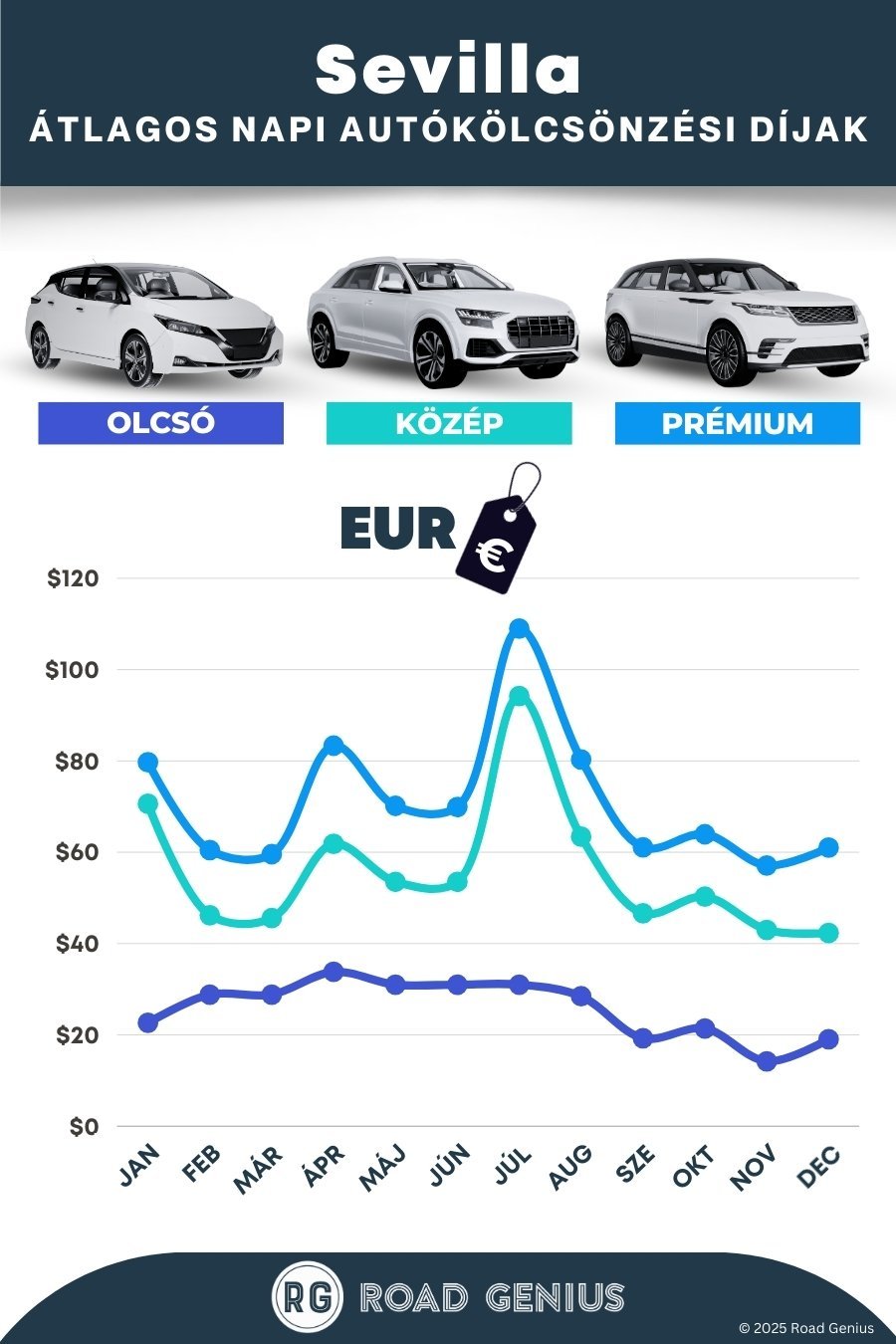 Átlagosan az autóbérlés Sevillában körülbelül 51 € naponta kerül, a legolcsóbb bérleti díjak pedig 14 €-tól indulnak naponta.